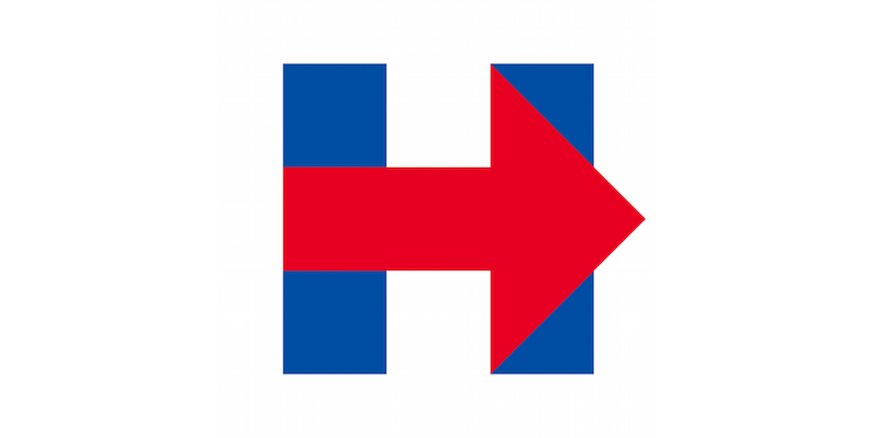 Le logo de campagne est tout simplement une lettre H composée de deux barres verticales bleues et d’une barre horizontale rouge en forme de flèche.