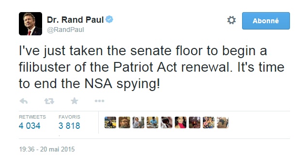 Vous souvenez-vous du filibuster de Rand Paul contre la nomination de John Brennan à la tête de la CIA en 2013? Et bien, sachez que le sénateur républicain et candidat à la présidence a récidivé hier. Il entendait cette fois s’opposer à la reconduction du Patriot Act.