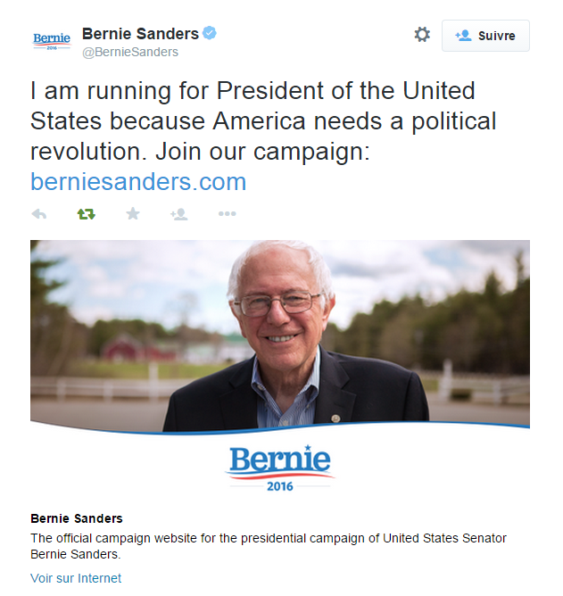 On peut aussi remarquer la mention Paid for by Bernie 2016 (not the billionaires) qui apparaît en bas de page. Cela reflète bien la volonté de Bernie Sanders de se présenter comme un candidat indépendant qui n’a pas reçu de donations importantes de grandes entreprises ou de lobbies.