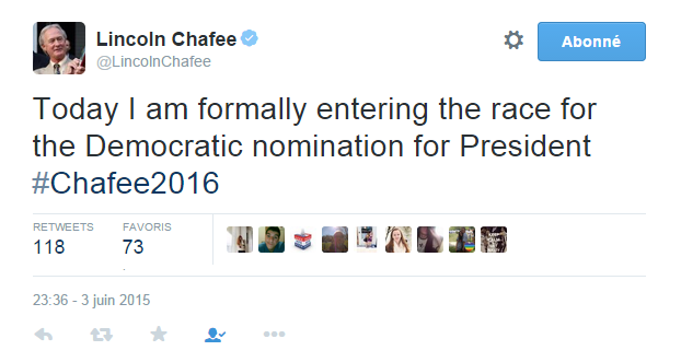 Tout est possible en politique mais Lincoln Chafee n’a a priori que très peu de chances de remporter les primaires démocrates. Il n’est pas très populaire (ses adversaires n’auront pas de mal à rappeler qu’il a quitté son poste de gouverneur avec seulement 26% d’opinions favorables) et les médias ne couvrent pour l’instant pas énormément sa campagne. Le fait qu’il ait été longtemps républicain puis indépendant avant de finalement rejoindre le Parti Démocrate pourrait aussi gêner certains électeurs. Sa candidature aura en revanche très certainement le mérite d’ouvrir le débat sur la question de la politique étrangère dans le camp démocrate, et ce alors que les trois autres candidats du parti (Clinton, Sanders et O’Malley) n’en parlent pour l’instant que très peu.