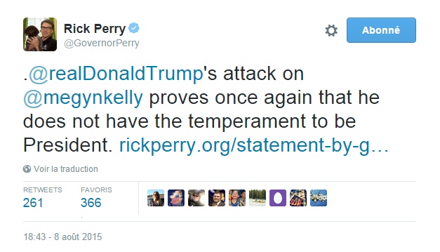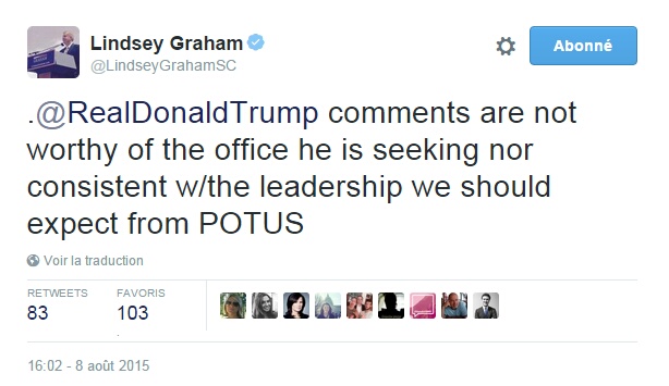 La guerre semble donc désormais bien déclarée entre Trump et la plupart de ses adversaires. D’autant plus que Donald Trump s’en est ensuite pris à Carly Fiorina qui avait été la première à le critiquer. Il a publié ce tweet à son sujet.