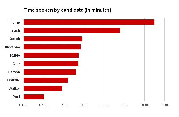 Dans les heures et les jours qui ont suivi le débat, on a également pu lire quelques statistiques intéressantes. Tout d’abord, le temps de parole n’a pas été égal pour tous les candidats. Chaque fois qu’un candidat était interrogé, il avait droit à 1 minute pour répondre. Lorsqu’il dépassait ce temps, une petite sonnerie retentissait. En théorie, un candidat ne pouvait donc pas monopoliser la parole plus longtemps qu’un autre. Mais tous les candidats n’ont pas été interrogés aussi souvent les uns que les autres et certains ont donc tout de même parlé plus longuement. C’est Donald Trump qui a eu le plus de temps de parole, suivi de Jeb Bush. Rand Paul est quant à lui le candidat ayant eu le moins de temps pour s’exprimer.