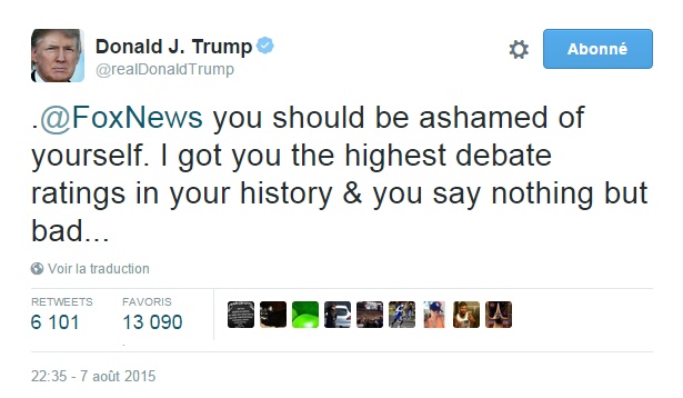 Après cet échange, le débat a continué tout à fait normalement mais Donald Trump semble être rancunier. En effet, quelques heures après la fin du débat, il publiait plusieurs tweets critiquant les journalistes de Fox News en général et Megyn Kelly en particulier.