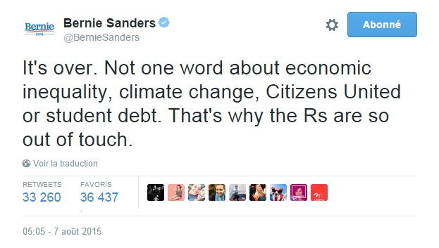 Le lendemain du débat, on apprenait également que celui-ci avait réuni plus de 24 millions de téléspectateurs, un record pour un débat pré-primaires ! On a aussi appris que Donald Trump avait été le candidat le plus mentionné par les internautes sur Facebook comme sur Twitter durant le débat (mentions positives et négatives réunies). Le moment ayant suscité le plus de commentaires fut le clash entre Chris Christie et Rand Paul concernant les écoutes téléphoniques. Enfin, le tweet politique le plus partagé de la soirée sur Twitter fut ce tweet du candidat démocrate Bernie Sanders.