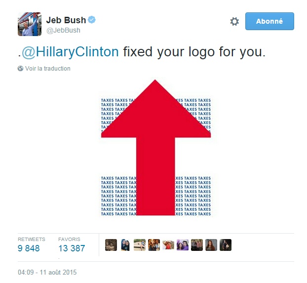 Et enfin, Bush a eu le dernier mot avec son fameux tweet présentant la version corrigée du logo d’Hillary Clinton et suggérant que son plan aurait pour effet d’augmenter inconsidérément les impôts des contribuables. Ce tweet a été le plus partagé des quatre tweets composant la conversation. 1-0 pour Jeb?