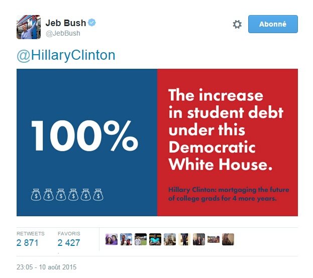Jeb Bush a décidé de réagir à ce tweet en rappelant que la dette étudiante avait augmenté sous l’actuelle administration démocrate.