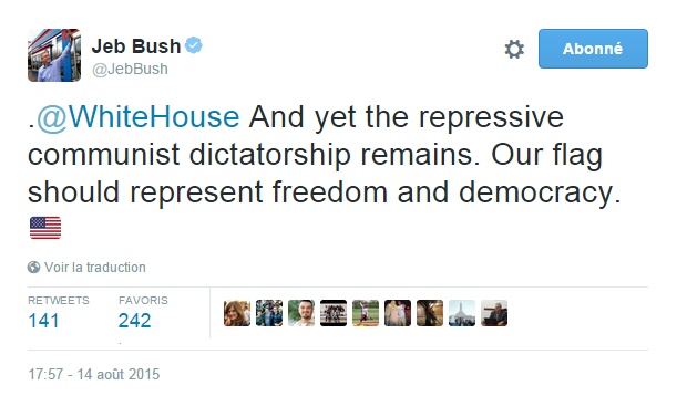 Marco Rubio a été dans le même sens et a aussi fortement critiqué le fait qu’aucun dissident cubain n’ait été invité à la cérémonie à l’ambassade. Jeb Bush a quant à lui publié ce tweet, en réponse à un autre tweet de la Maison Blanche qui annonçait que le drapeau américain flottait à nouveau à La Havane.