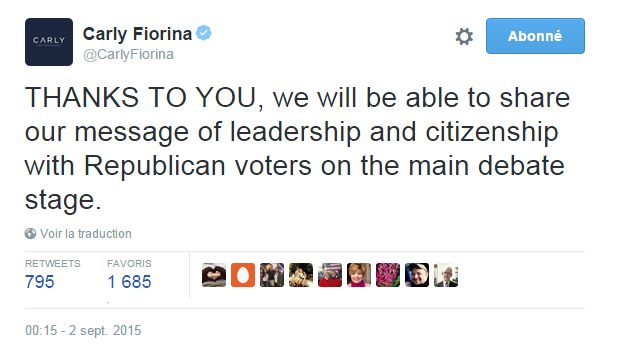 2/ La chaîne CNN a annoncé qu’elle modifiait les conditions d’admission à son débat entre candidats républicains qui doit avoir lieu le 16 septembre. Comme Fox News, CNN avait initialement prévu d’inviter les dix candidats les mieux classés dans les sondages à son débat principal, alors que les sept autres auraient le droit de participer à un happy hour debate. Pour distinguer les dix candidats les mieux classés, CNN avait annoncé qu’elle effectuerait une moyenne de la position des candidats dans les sondages ayant été effectués entre le 16 juillet et le 10 septembre. Mais le cas de Carly Fiorina est venu remettre en question cette méthode. En effet, Fiorina se classe dans le Top 10 des intentions de vote aux primaires républicaines dans tous les sondages effectués depuis un mois, c’est-à-dire depuis sa prestation remarquée lors du happy hour debate de Fox News. Par conséquent, elle n’a pas manqué de faire savoir qu’elle estimait avoir gagné le droit de défendre ses idées lors du débat principal de CNN. Mais d’après les critères annoncés par la chaîne, ce n’était pas le cas puisque sa moyenne calculée depuis la mi-juillet restait insuffisante (notamment parce que moins de sondages ont été effectués depuis le débat de Fox News que lors de la période précédente). Fiorina s’est alors plainte de la situation auprès de la direction du Parti Républicain et a recueilli le soutien de nombreux élus. Sous la pression, CNN a annoncé qu’elle ajoutait un critère de sélection supplémentaire « afin de mieux refléter l’état de la course depuis le premier débat ». Les critères de sélection de départ restent donc valables mais si un candidat se situe constamment dans le Top 10 dans l’ensemble des sondages effectués entre le 7 août (lendemain du débat de Fox News) et le 10 septembre, il sera également invité à prendre part au débat principal. Ce qui signifie que celui-ci pourrait voir s’affronter plus de dix candidats. Grâce à ce nouveau critère de sélection, Carly Fiorina devrait donc pouvoir participer au débat principal. La candidate s’est réjouie de la décision de CNN.