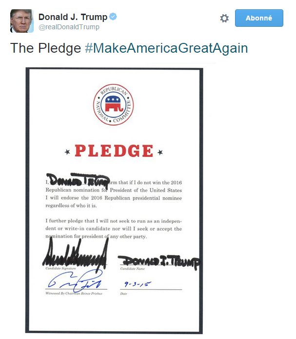 1/ Tous les candidats républicains à la présidence, y compris Donald Trump (et c’est là que se situe l’information importante), ont signé un document rédigé par le Parti Républicain et intitulé Pledge (littéralement, promesse). En signant ce document, ils se sont tous engagés, en cas de défaite aux primaires :