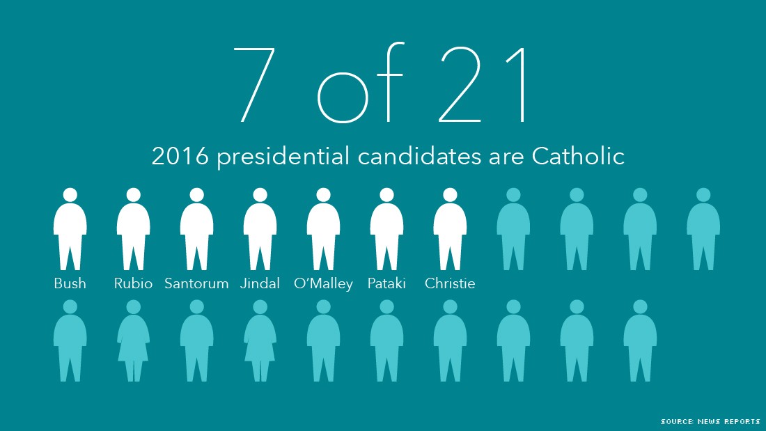 D’autre part, sept candidats à la présidence (sur 21) sont catholiques. Il s’agit des républicains Jeb Bush, Marco Rubio, Chris Christie, Rick Santorum, Bobby Jindal, George Pataki et du démocrate Martin O’Malley.