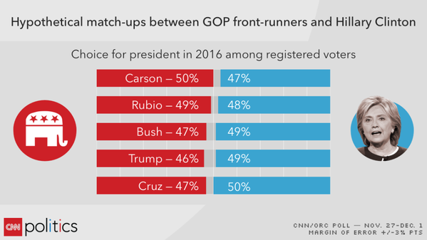 CNN a également interrogé un panel représentatif de l’ensemble des électeurs américains au sujet d’un éventuel duel entre plusieurs candidats républicains et la Démocrate Hillary Clinton (qui reste ultra-favorite des primaires dans son camp).