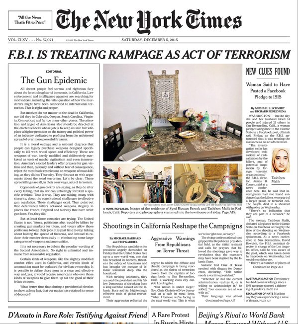 Un éditorial du prestigieux New York Times a encore davantage fait réagir que la Une du New York Daily News. Il est intitulé The Gun Epidemic (L’épidémie des armes à feu). Le comité de rédaction du journal y qualifie notamment la facilité avec laquelle les citoyens peuvent se procurer des armes de guerre aux Etats-Unis de national disgrace (honte nationale). On peut aussi y lire que les américains devraient être en colère contre leurs élus qui accordent plus d’importance aux intérêts de l’industrie des armes à feu qu’à leur sécurité. Les auteurs reprennent également l’argument mis à la Une par le New York Daily News, à savoir que les hommes politiques ne font qu’offrir leurs prières aux victimes mais refusent ensuite de modifier la législation. On peut également lire que l’argument selon lequel une réforme n’empêchera jamais les pires criminels de se procurer une arme est vrai, comme en témoigne le fait que des meurtriers parviennent à se procurer des armes dans des pays à la législation plus stricte.