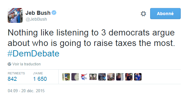 Les tweets de candidats républicains commentant le débat n’ont pas été très nombreux cette fois-ci. On a tout de même également eu droit à ce tweet de Jeb Bush.