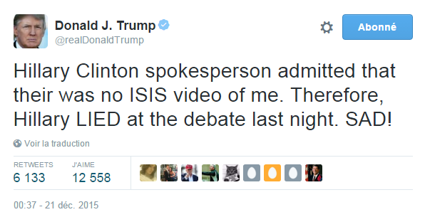 Problème? Aucun des journalistes ayant tenté de vérifier cette information n’a trouvé de trace de telles vidéos de l’Etat Islamique mettant en scène Donald Trump. L’équipe de campagne de Clinton a fini par reconnaître que ces vidéos n’existaient pas, ou du moins pas encore. On comprend que Clinton ait voulu dénoncer le fait que Trump joue le jeu de l’Etat Islamique en stigmatisant l’ensemble des musulmans (et elle a sans doute raison sur ce point), mais il n’empêche que son affirmation concernant l’existence de vidéos de l’Etat Islamique utilisant l’image de Donald Trump était mensongère. Donald Trump ne s’est pas fait prier pour dénoncer ce mensonge et exiger des excuses.