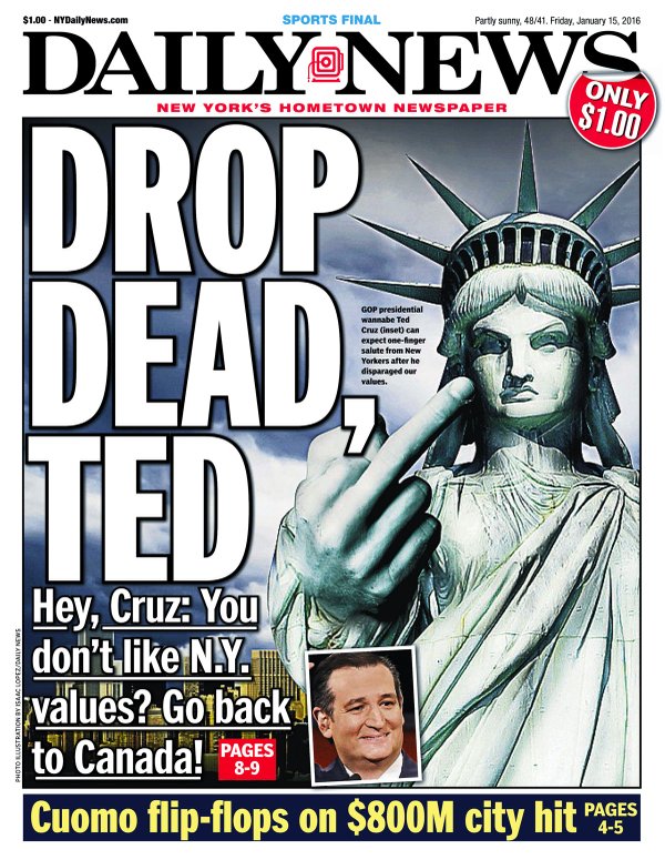 Le New York Daily News s’est lui aussi emparé de l’affaire en faisant une nouvelle Une choc. On y voit la statue de la liberté faire un doigt d’honneur à Ted Cruz. Le titre? Va te faire foutre, Ted.