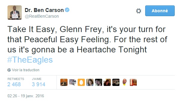 Ben Carson a quant à lui publié un très joli tweet pour rendre hommage à Glenn Frey. Il est malheureusement difficilement traduisible en français. Le message inclut les titres de trois chansons du groupe : Take It Easy, Peaceful Easy Feeling et Heartache Tonight.