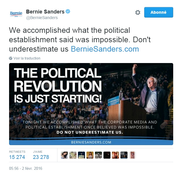 Bernie Sanders. Dans un discours prononcé alors que les résultats définitifs du caucus démocrate n’étaient pas encore connus, Bernie Sanders s’est réjoui de faire jeu égal avec Hillary Clinton. Et il a affirmé que la « révolution politique » avait débuté.
