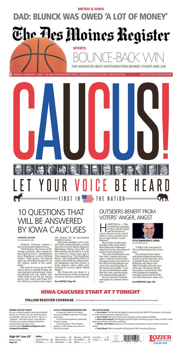 La Une du Des Moines Register le 1er février, jour du scrutin :