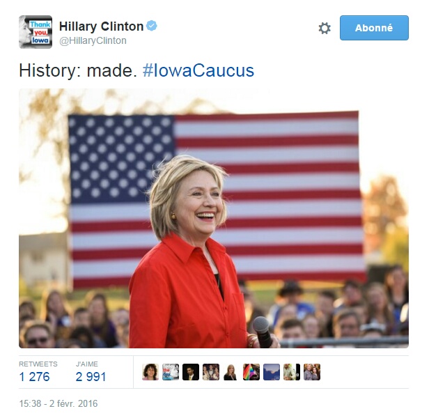 L’élection fut extrêmement serrée entre Hillary Clinton et Bernie Sanders. Hillary l’a finalement emporté d’une très courte tête, devenant ainsi la première femme à remporter un caucus en Iowa. Elle s’en est réjouie sur Twitter.