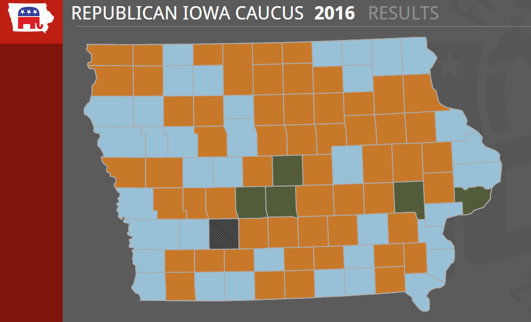 L’Iowa compte 99 comtés. En orange sur la carte ci-dessous, les comtés remportés par Ted Cruz. En bleu, ceux remportés par Donald Trump. Et en vert, ceux remportés par Marco Rubio. (Dans l’unique comté en bleu foncé, Ted Cruz et Donald Trump ont obtenu exactement le même nombre de voix).