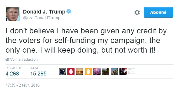 Suite à ce bref discours, Donald Trump ne s’est pas exprimé (même pas sur Twitter) pendant 15 heures. Un record depuis le début de sa campagne ! Mais rassurez-vous, il a vite retrouvé la forme après ce petit coup de blues. Pour son retour sur Twitter, il a regretté que le fait qu’il soit le seul candidat à financer lui-même sa campagne n’ait pas été suffisamment récompensé.