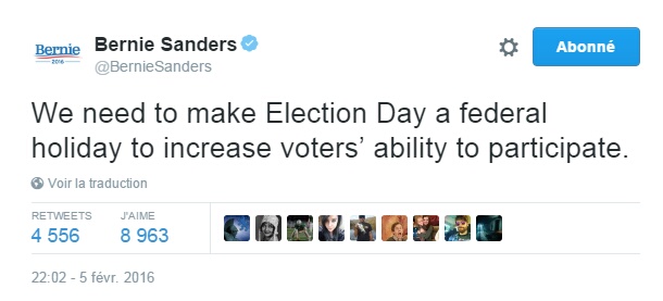 1 – Ce tweet de Bernie Sanders proposant de faire du jour de l’élection présidentielle (qui a toujours lieu un mardi) un jour férié afin d’augmenter la participation électorale. Qu’en pensez-vous ?