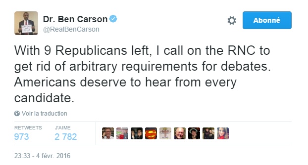 Ce huitième débat républicain avait lieu au Saint Anselm College, dans le New Hampshire. Il était organisé par la chaîne ABC News. Après avoir boycotté le débat précédent, Donald Trump était de retour. À l’inverse, Carly Fiorina n’avait pas été invitée et son absence a suscité la polémique. Quelques explications sur ce point. Comme vous le savez, vu le nombre important de candidats républicains, les chaînes de télévision se sont, depuis le début de la campagne, basées sur les sondages pour établir la liste des participants à leurs débats. Les candidats les mieux classés étant invités à participer à un débat principal et les autres à un Happy Hour Debate. Mais depuis quelques jours, les candidats à l’investiture républicaine ne sont plus que neuf. C’est pourquoi ABC avait choisi de supprimer le Happy Hour Debate. Autrement dit, un seul débat était organisé et sept candidats sur neuf y avaient été invités. Les deux exclus? Carly Fiorina et Jim Gilmore. ABC avait décidé d’inviter d’office les trois candidats arrivés en tête en Iowa (Cruz, Trump et Rubio). Pour se qualifier, les autres devaient faire partie des six candidats les mieux classés dans les sondages au niveau national et/ou au New Hampshire. Seuls Fiorina et Gilmore ne remplissaient pas ces critères. Mais comment expliquer que Fiorina ne puisse pas participer à ce débat alors qu’elle a obtenu davantage de voix en Iowa que John Kasich et Chris Christie? Le résultat d’une élection ne compte-t-il pas autant, voire plus, que les sondages? Carly Fiorina a mis cet argument en avant pour protester contre son exclusion. Elle a été soutenue par certains de ses adversaires. Ted Cruz a ainsi qualifié la décision d’ABC d’ « erreur » et a appelé la chaîne à inclure Fiorina dans le débat. Ben Carson a publié un tweet allant dans le même sens.
