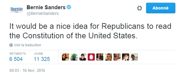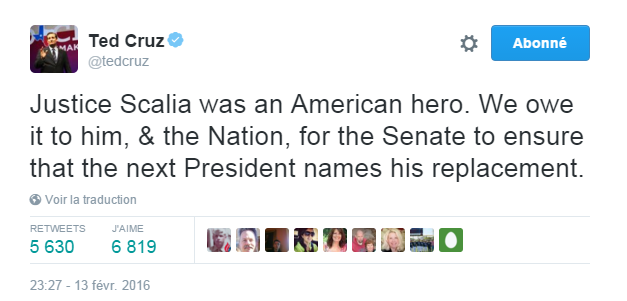 The American people should have a voice in the selection of their next Supreme Court Justice. Therefore, this vacancy should not be filled until we have a new President. (Le peuple américain devrait avoir son mot à dire dans la sélection de son prochain juge à la Cour Suprême. Par conséquent, ce poste vacant ne devrait pas être rempli jusqu’à ce que nous ayons un nouveau Président)