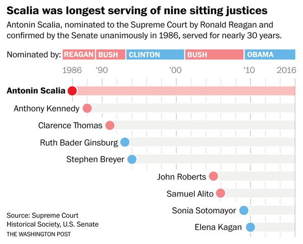 Parmi les neuf juges composant actuellement la Cour Suprême, Antonin Scalia était celui qui était en poste depuis le plus longtemps, presque 30 ans ! Il avait été nommé en 1986 par le Président Reagan. Un autre juge, Anthony Kennedy, a également été nommé par Reagan. Un autre a été nommé par George Bush (Clarence Thomas), deux par Bill Clinton (Ruth Ginsburg et Stephen Breyer), deux par George W. Bush (John Roberts, qui est actuellement le Chief Justice, et Samuel Alito) et deux par Barack Obama (Sonia Sotomayor et Elena Kagan).