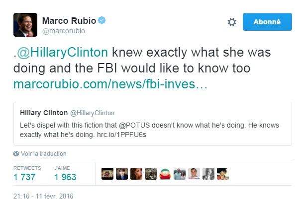 Acte 2 : Marco Rubio reprend le tweet de Clinton et y ajoute le commentaire suivant : « Hillary Clinton savait exactement ce qu’elle faisait et le FBI aimerait le savoir aussi ». Référence bien sûr au serveur privé utilisé par Hillary Clinton alors qu’elle était Secrétaire d’Etat et sur lequel le FBI enquête actuellement.