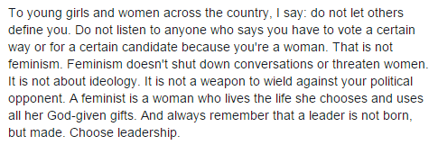 Aux jeunes filles et aux femmes dans tout le pays, je dis: ne laissez pas les autres vous définir. N’écoutez pas quelqu’un qui dit que vous devez voter d’une certaine manière ou pour un certain candidat parce que vous êtes une femme. Ce n’est pas du féminisme. Le féminisme n’interrompt pas les conversations et ne menace pas les femmes. Ce n’est pas une question d’idéologie. Ce n’est pas une arme que l’on brandit contre son opposant politique. Une féministe est une femme qui vit la vie qu’elle choisit et utilise tous les cadeaux que Dieu lui a donnés. Et souvenez-vous toujours qu’on ne naît pas leader, on le devient. Choisissez le leadership.