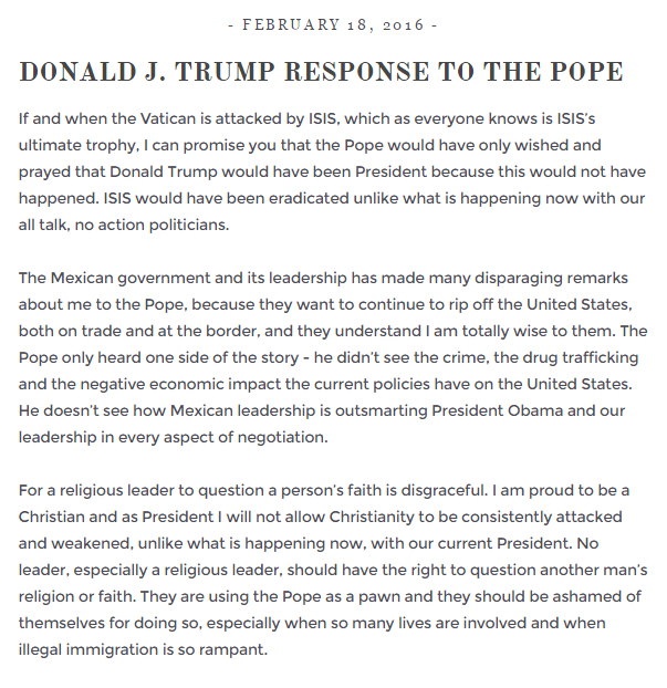 Donald Trump n’a pas du tout apprécié la remarque et a répondu au Pape dans un communiqué assez hallucinant. Il y déclare notamment que si l’Etat Islamique venait à attaquer le Vatican, le Pape prierait pour qu’il soit Président des Etats-Unis ! Il déclare aussi qu’il est honteux pour un leader religieux de juger de l’authenticité de la foi de quelqu’un.