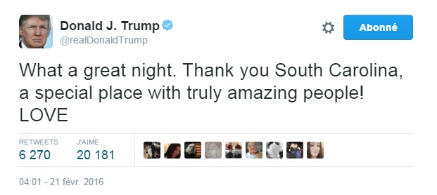 PS: Prochain rendez-vous électoral pour les Républicains ⇒ caucus du Nevada ce mardi 23 février. Pour les Démocrates ⇒ primaire de Caroline du Sud samedi 27 février. Ensuite, ce sera le Super Tuesday le mardi 1er mars.