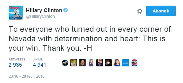 Hillary Clinton. Après une victoire d’une très courte tête en Iowa et une lourde défaite dans le New Hampshire, Hillary Clinton avait besoin de remporter le caucus du Nevada. Elle y est parvenue.