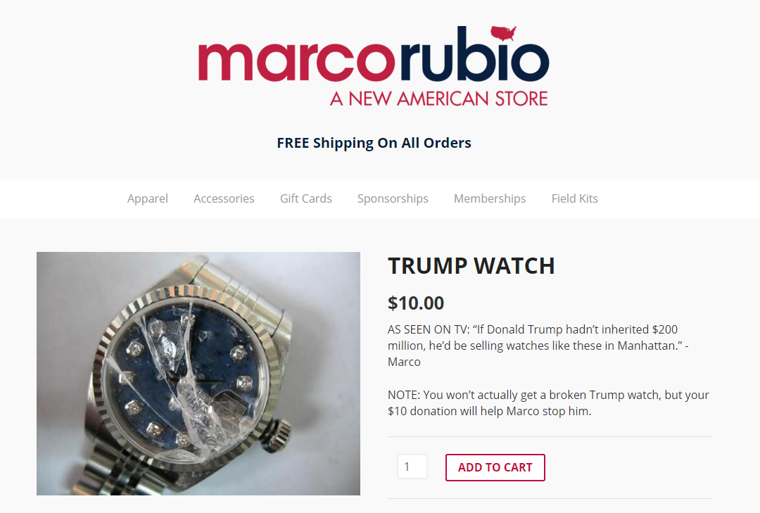 Les sympathisants de Rubio sont invités à faire un don de 10$ à sa campagne. Il est écrit qu’ils ne recevront en réalité pas de montre cassée de Donald Trump en échange, mais que leur contribution aidera Rubio à « le stopper ».