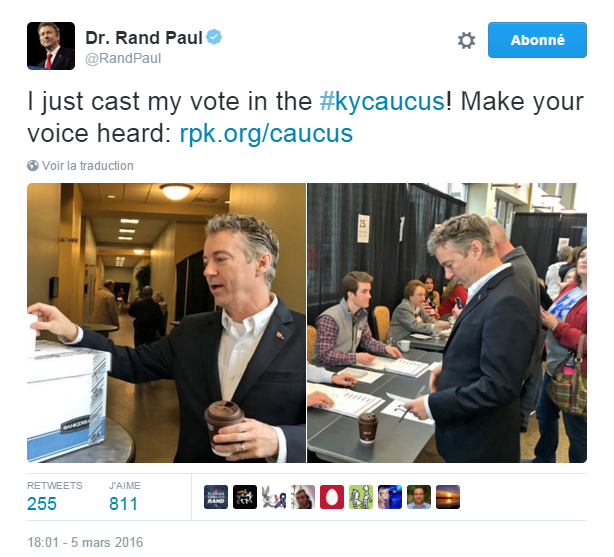Rand Paul a fait savoir sur son compte Twitter qu’il avait accompli son devoir de citoyen et a incité tout le monde à faire de même. Il a en revanche refusé de dire pour qui il avait voté. Notons aussi qu’il a obtenu 872 voix lors de ce caucus.