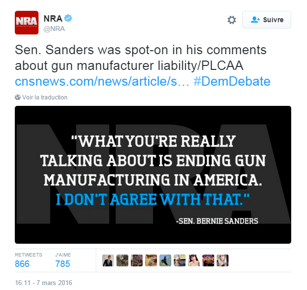 Sanders ira même jusqu’à dire que si on allait jusque-là, cela reviendrait à mettre fin à la vente légale d’armes aux Etats-Unis. Et il s’y oppose. Hillary Clinton comparera la position de Sanders à celle de la NRA. Celle-ci publiera d’ailleurs un tweet reprenant la déclaration de Sanders et affirmant qu’il a parfaitement raison.