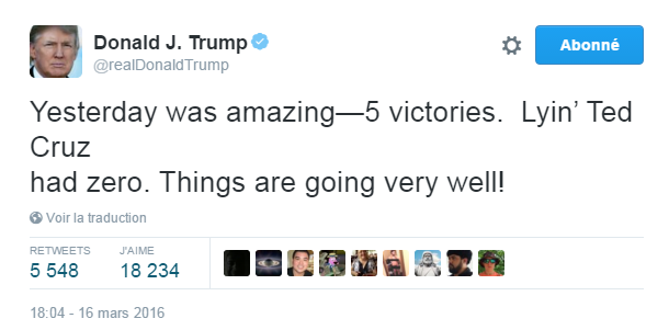 Donald Trump. Certes, la large victoire de John Kasich en Ohio a retenu l’attention des médias. Mais Donald Trump remporte tous les autres états en jeu (à moins d’un revirement de situation de dernière minute dans le Missouri). Dans le même temps, son rival le plus sérieux, Ted Cruz, ne remporte aucune victoire. Comme Clinton, Trump confirme donc encore un peu plus son statut de favori.