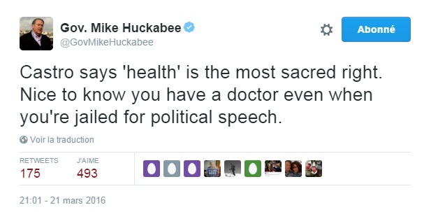 Lors de cette même conférence de presse, Raúl Castro a également émis des critiques à l’encontre du système américain. Il a notamment dénoncé le fait que tous les américains n’aient pas un accès suffisant aux soins de santé ou que les femmes n’aient pas le même salaire que les hommes. Le Républicain Mike Huckabee a réagi à ces propos sur Twitter.