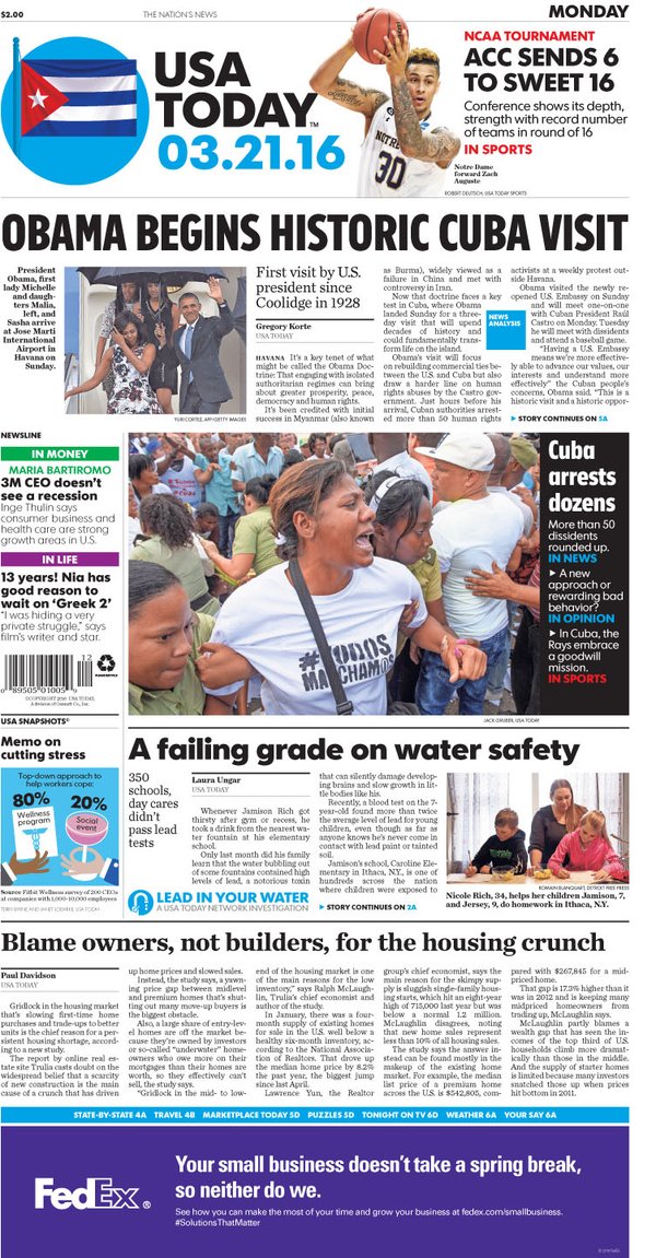 Le plus grand quotidien américain, USA Today, consacre sa Une à l’arrivée de Barack Obama à Cuba. Le drapeau cubain est même mis à l’honneur à côté du nom du journal (en haut à gauche). Toutefois, le quotidien rappelle également que plusieurs dizaines de militants des droits de l’homme ont été arrêtés quelques heures avant l’arrivée du président américain sur l’île.