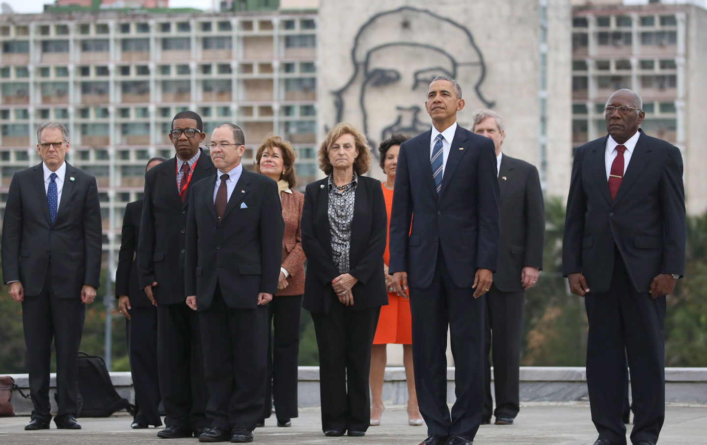 Barack Obama entame sa deuxième journée à La Havane. Il se rend sur la Place de la Révolution où se situe le mémorial de José Marti, célèbre poète et héros de l’indépendance cubaine. Il lui rend hommage en y déposant une gerbe de fleurs. Mais l’un des buildings de la Place de la Révolution est également orné d’un portrait géant de Che Guevara. Les photographes captureront donc ces clichés insolites où l’on voit un président américain se recueillir sous le regard du célèbre révolutionnaire.