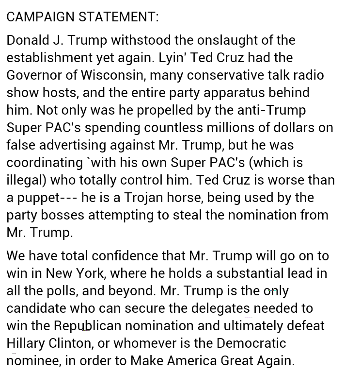 Donald J. Trump a encore une fois résisté aux attaques de l’establishment. Le menteur Ted Cruz avait le gouverneur du Wisconsin, de nombreux animateurs de radio conservateurs, et tout l’appareil du parti derrière lui. Il n’a pas seulement été poussé par des Super PAC anti-Trump dépensant des millions de dollars en publicité mensongère contre Mr. Trump, mais il s’est coordonné avec son propre Super PAC (ce qui est illégal)* qui le contrôle complètement. Ted Cruz est pire qu’une marionnette — il est un cheval de Troie, utilisé par les patrons du parti qui essayent de voler la nomination à Mr. Trump. Nous sommes totalement confiants que Mr. Trump va continuer et gagner à New York, où il dispose d’une large avance dans tous les sondages, et au-delà. Mr. Trump est le seul candidat qui puisse obtenir les délégués nécessaires pour gagner la nomination Républicaine et finalement battre Hillary Clinton, ou quiconque sera le nominé Démocrate, de façon à rendre l’Amérique grande à nouveau.