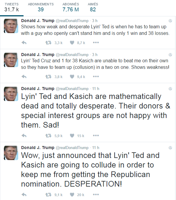 Les directeurs de campagne de Ted Cruz et John Kasich auraient discuté pendant plusieurs semaines avant de parvenir à cet accord. Donald Trump a évidemment réagi. Dans une série de tweets, il a accusé ses deux rivaux de « collusion » et a affirmé que tout cela prouvait qu’ils étaient totalement désespérés.