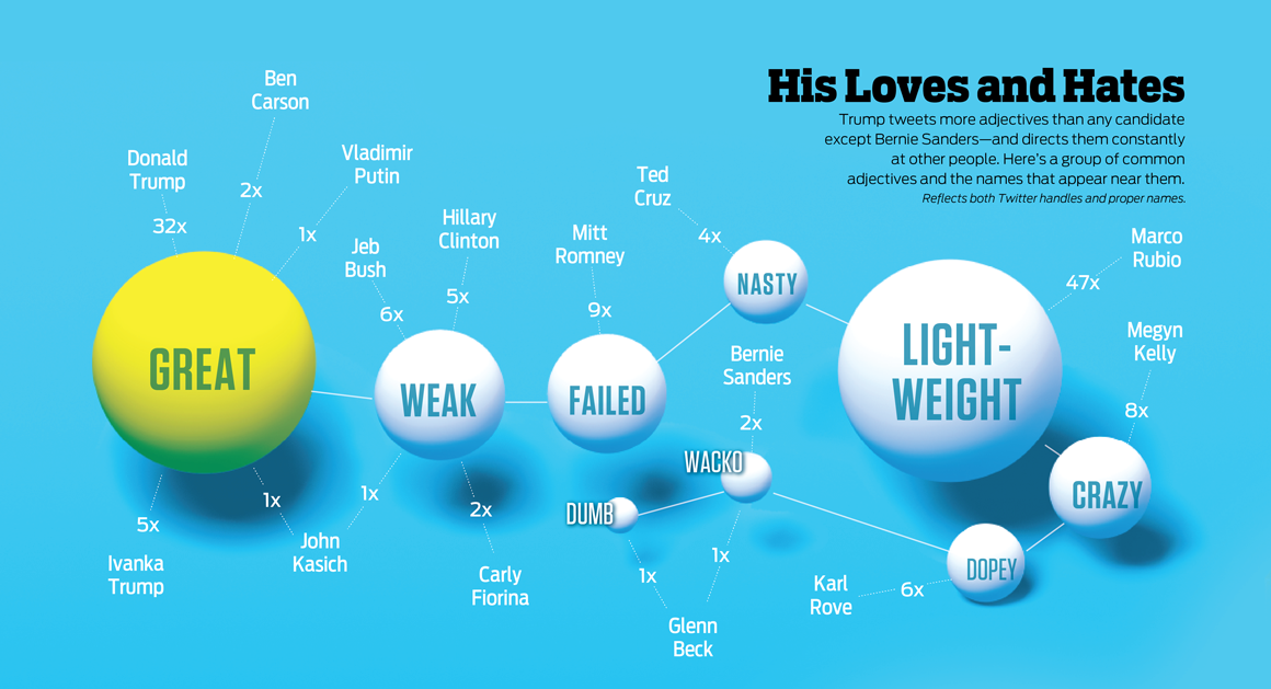 Des journalistes de Politico ont analysé les désormais fameux tweets de Donald Trump. Ils ont découvert que, depuis août 2015, les quatre mots que Trump a le plus souvent utilisé sur Twitter sont I (Je), You (Tu/Vous), Great (Grand) et… Trump ! Voici aussi une infograhie montrant les adjectifs utilisés le plus régulièrement, ainsi que les personnes auxquelles ils ont été le plus souvent adressés. Mention spéciale à Marco Rubio, qui s’est fait traiter de « light-weight » (poids léger) pas moins de 47 fois !
