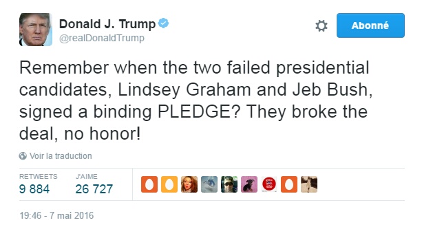 Notons que Graham et Bush sont les deux seuls ex-candidats aux primaires à avoir affiché une position anti-Trump cette semaine. Peut-être parce qu’en septembre dernier, tous les candidats aux primaires républicaines avaient signé un document rédigé par la direction du parti, dans lequel ils s’engageaient solennellement à soutenir le candidat qui remporterait l’investiture. Ce document n’a aucune valeur juridique mais Donald Trump n’a pas manqué de faire remarquer que Graham et Bush n’avaient pas tenu parole.