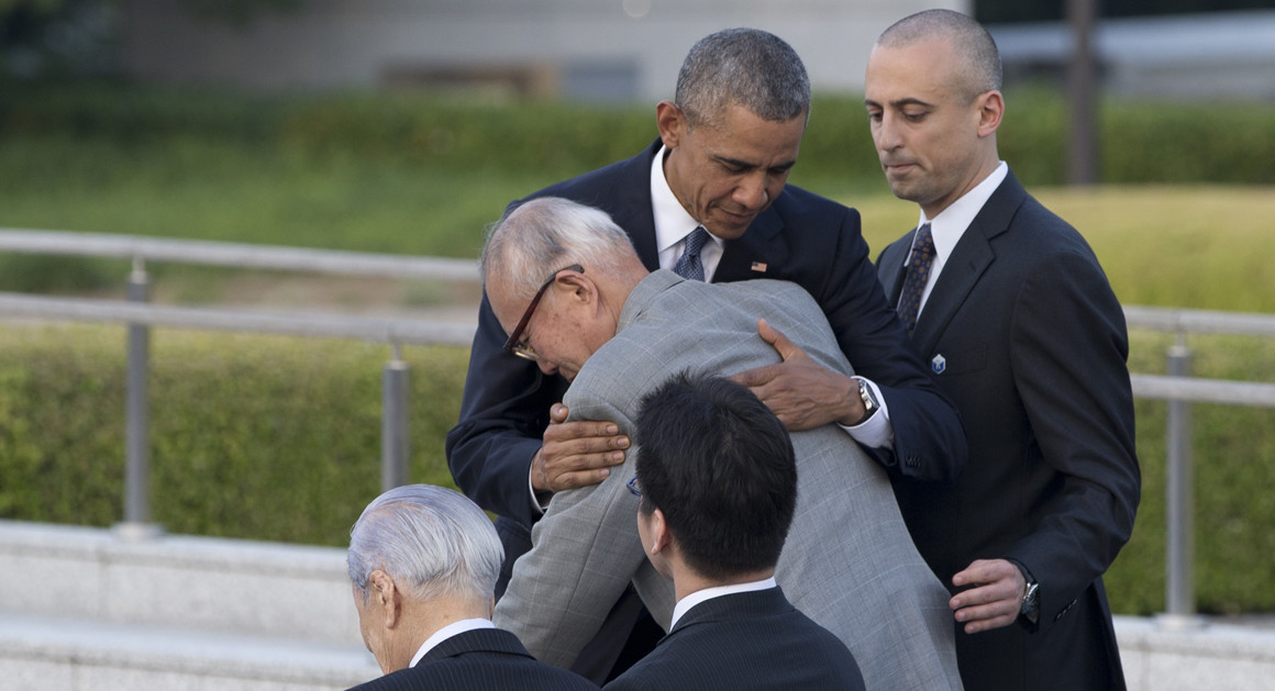 Après son discours, Barack Obama a rencontré les survivants du bombardement venus l’écouter. Parmi eux, Shigeaki Mori, qu’il a serré dans ses bras.