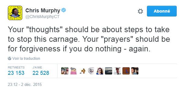 À l’occasion du Nouvel An, il avait également publié une série de 78 tweets consécutifs (!) qui énuméraient toutes les fusillades de masse survenues aux Etats-Unis au cours de l’année 2015. NB: On parle de fusillade de masse (mass shooting) lorsque plus de trois victimes (sans compter le tireur si celui-ci a été abattu par les forces de l’ordre) sont à déplorer. Il concluait cette série de tweets en disant que la bonne résolution 2016 de tous les parlementaires devrait être de faire évoluer la législation pour lutter contre cette épidémie de violence.