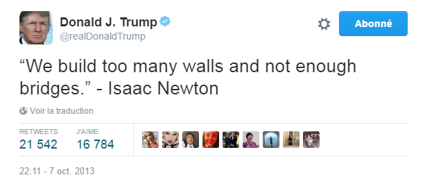 3 – Il fut un temps où Donald Trump citait Isaac Newton sur Twitter… Savoureux ! (Tweet publié le 7 octobre 2013)