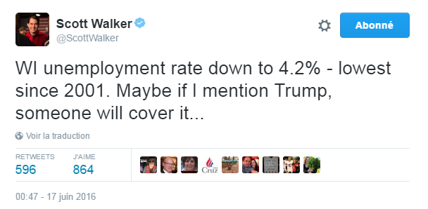 2 – Scott Walker, gouverneur républicain du Wisconsin, visiblement agacé par le fait que les médias ne parlent pas assez de ses exploits et un peu trop de ceux de Donald Trump.