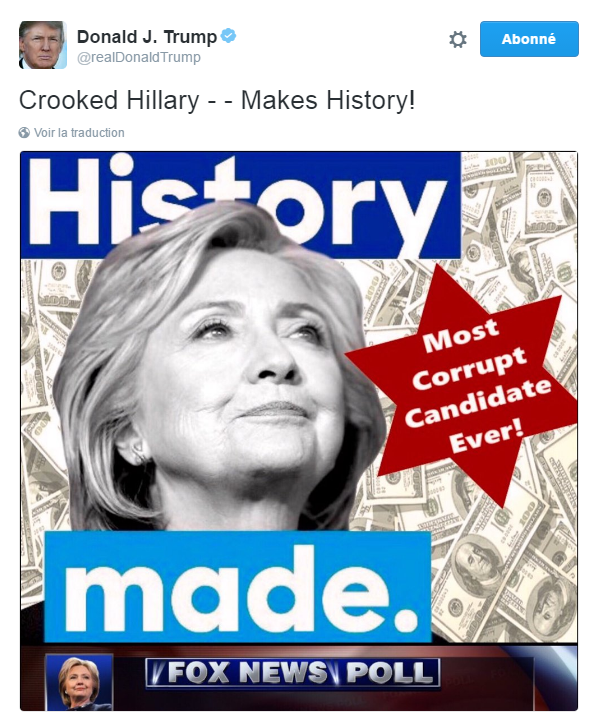 L’image que contient le tweet a été retouchée à l’aide d’un logiciel de type Photoshop. L’image de base est celle de la photo de profil qu’avait affichée Hillary Clinton après avoir remporté l’investiture démocrate. On y voyait son visage accompagné du slogan History Made. Sur la photo partagée par Trump, des billets de banque ont été ajoutés en guise de fond. On aperçoit aussi la mention Most Corrupt Candidate Ever! (La candidate la plus corrompue de tous les temps!) dans une étoile rouge à six branches. C’est évidemment la présence de cette étoile qui a fait réagir bon nombre d’internautes et de journalistes. D’après eux, il s’agirait d’une étoile de David. Or, le fait d’associer la corruption et l’argent à l’étoile de David serait antisémite. Donald Trump s’est défendu en affirmant que toutes les étoiles à six branches n’étaient pas forcément des étoiles de David et que l’étoile figurant dans son tweet évoquait celle que porte les shérifs américains sur leur uniforme.